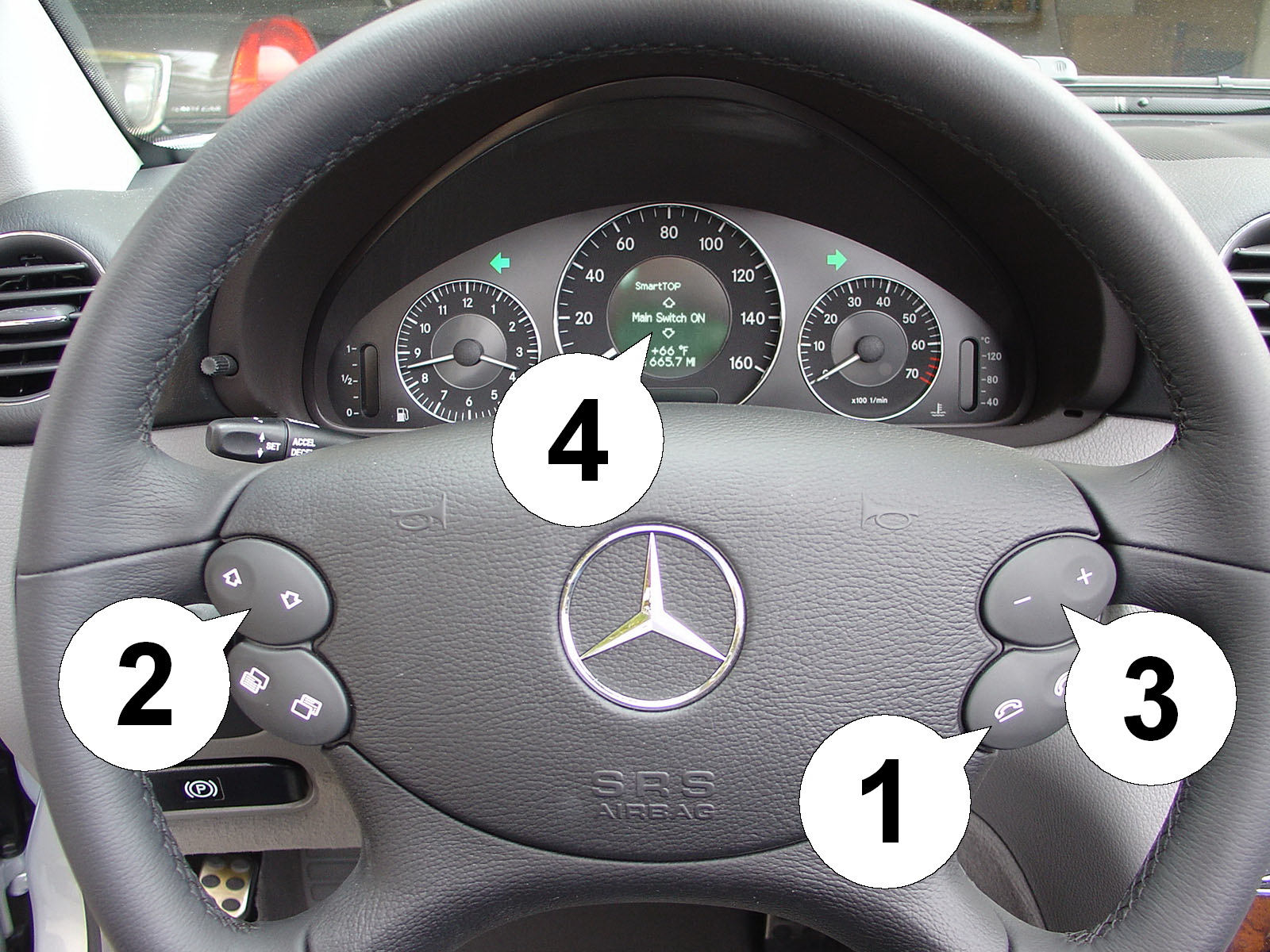 This function allows convenient One-Touch operation for the seat memory buttons or the automatic activation of seat position when turning the ignition on or off. • Setting 1 activates only the One-Touch operation. • Setting 2 recalls seat position 2 when turning the ignition on. • Setting 3 recalls seat position 3 when turning the ignition off. • Setting 4 recalls positions 2 and 3 when turning the ignition on and off respectively. Operation of the seat memory is analog to the console top switch. A long hold only moves the seat as long as the button is held. A short tap automatically moves the seat to the selected position. IMPORTANT: This function ONLY works on the SL for technical reasons and should stay disabled on the SLK/CLK. |
