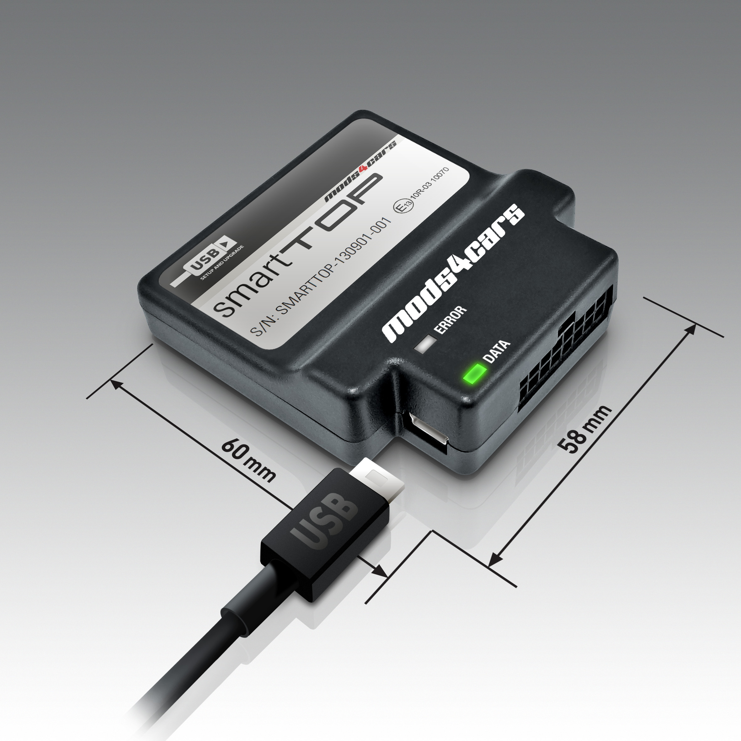 Beim Starten und Abstellen des Motors wird eine laufende Verdeckbewegung nicht unterbrochen. Die Verdecksteuerung kann bedarfsweise komplett deaktiviert werden. Alle Funktionen sind nach den persönlichen Wünschen programmierbar. Der am SmartTOP angebrachte USB-Anschluss gibt die Möglichkeit, das Modul am heimischen PC/MAC zu konfigurieren. Außerdem können Software-Aktualisierungen aufgespielt werden, die Mods4cars den Kunden kostenfrei zur Verfügung stellt.